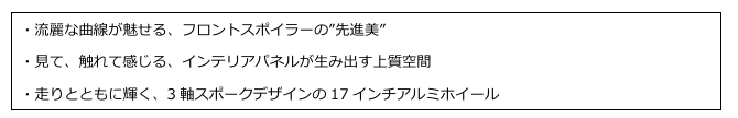 「Glamorous Sharpnessグラマラス シャープネス」をコンセプトに、やわらかな造形がもたらす温かみと、シャープなエッジラインによる先進的な表情を融合し、コンパクトカーにおける新しい上質感を表現している。