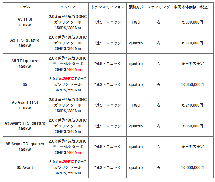 新型Audi A5シリーズは、電動リヤハッチゲートを備えたセダンタイプとステーションワゴンタイプのAvantの2タイプ。出力の異なる2種類の2.0 ℓ直列4 気筒直噴ガソリンターボTFSIエンジン、または2.0ℓ直列4 気筒直噴ディーゼルターボTDIエンジンを搭載している。2.0 ℓ TFSI直噴ガソリンエンジンは、VTG(可変タービンジオメトリー)付きのターボチャージャーを装備し、部分負荷で極めて燃費効率の良い改良型燃焼プロセスを採用している。VTGによりガソリンエンジンでも低回転域でトルクの一貫した俊敏な立ち上がりが可能。280Nmを発揮する110 kW仕様は前輪駆動モデル、340Nmを発揮する150 kW仕様は、AWDクラッチ付きquattro四輪駆動。ともに、7速Sトロニックトランスミッションと組み合わされる。