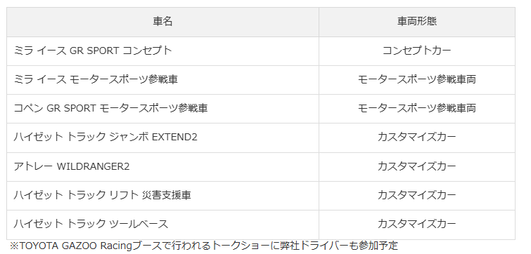 地域貢献では、災害支援を通じて得た知見をもとに、必要な電源やオリジナル防災セット等を搭載した「アトレー WILDRANGER2」や九州北部豪雨災害支援でボランティア サテライトセンターとして活躍した「ハイゼット トラック リフト 災害支援車」、工事現場の作業環境を改善する「ハイゼット トラック ツールベース」を出展する。