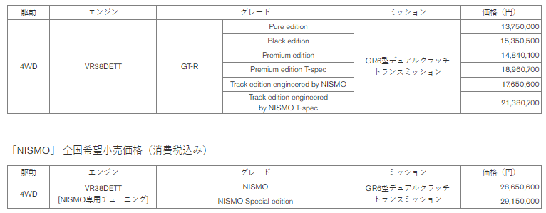 「NISSAN GT-R」2024年モデル 全国希望小売価格(消費税込み)