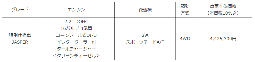 ・マッドフラップやカーゴフェンスなどアウトドアレジャーでの使い勝手を高める専用のオリジナルアクセサリーを組み合わせた「JASPERコンプリートパッケージ」を、ディーラーオプションで設定していく。メーカー希望小売価格は、135,740円(本体128,480円、参考取付工賃7,260円、消費税10%込)