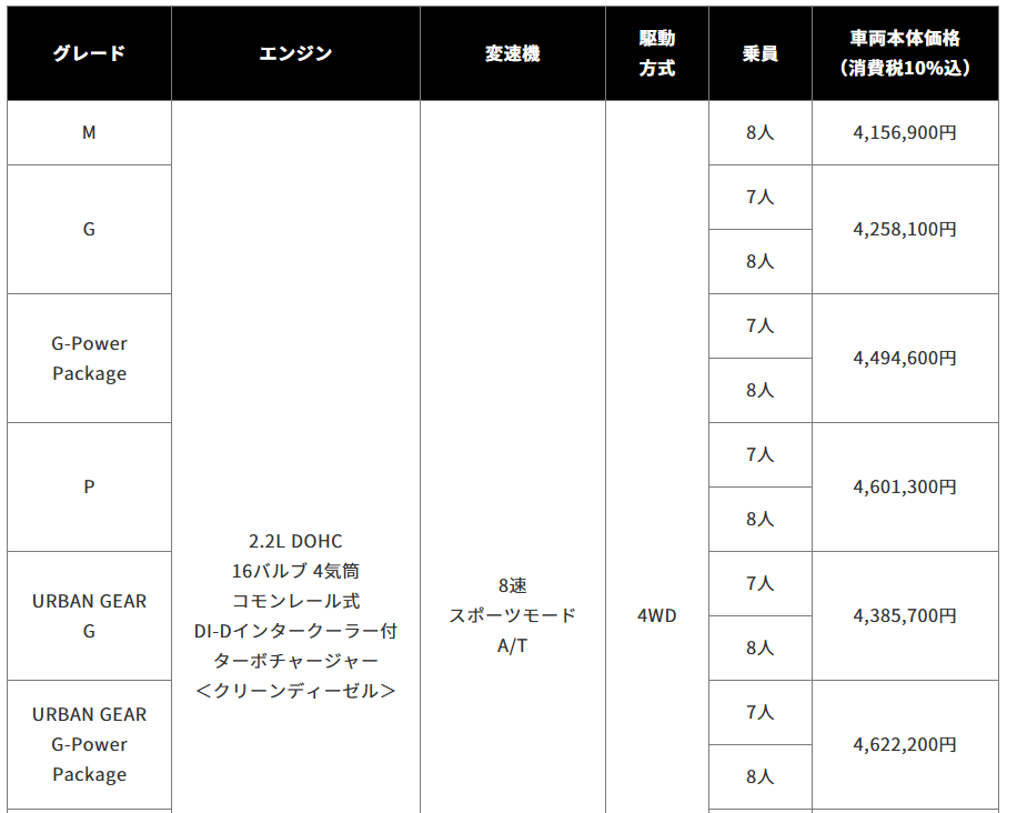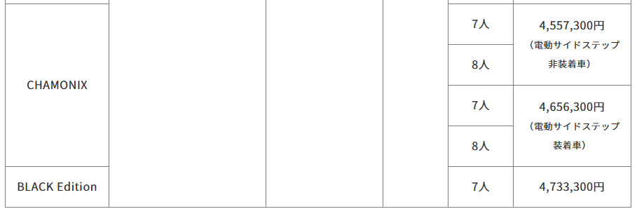特別仕様車「BLACK Edition」のメーカー希望小売価格は4,733,300円(消費税10%込)、「CHAMONIX」のメーカー希望小売価格は4,557,300~4,656,300円(消費税10%込)。