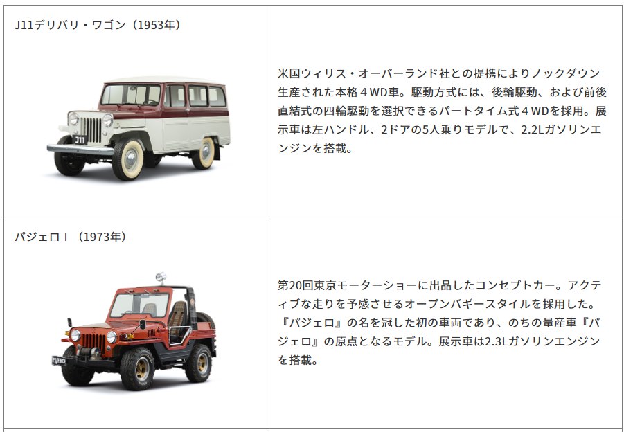 三菱自動車ブースでは、クロスカントリー4WDの走破性と乗用車並みの快適性を両立した、1980年代当時としては画期的な商品であった『パジェロ』の初代モデルと2代目モデルのほか、『パジェロ』の礎的な存在であった『J11デリバリ・ワゴン』、『パジェロ』のコンセプトカーである『パジェロⅠ』、初代『パジェロ』のダカールラリー優勝車の5台を展示します。展示車の概要は以下の通り。