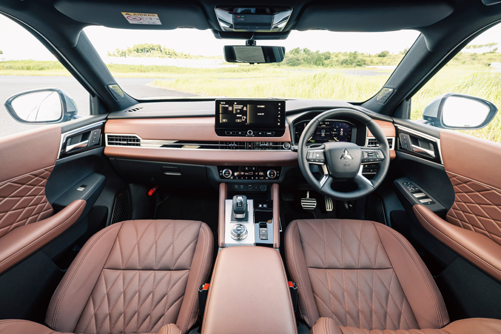 スマートフォン連携ナビゲーションでは、モニターサイズを従来の9インチから12.3インチに大型化し、コネクティッド機能(MITSUBISHI CONNECT*3)の機能拡充により、ナビゲーション上でPlaces API(Google*4による目的地検索)や、ストリートビュー、航空写真ビューを見ることが可能となった。また、運転席、助手席には、体とシート間の熱こもりを防ぎ快適なドライブを提供するシートベンチレーション*5や、常に優れた後方視界を提供するデジタルルームミラー(フレームレス)*6などを採用し、利便性と快適性を高めている。