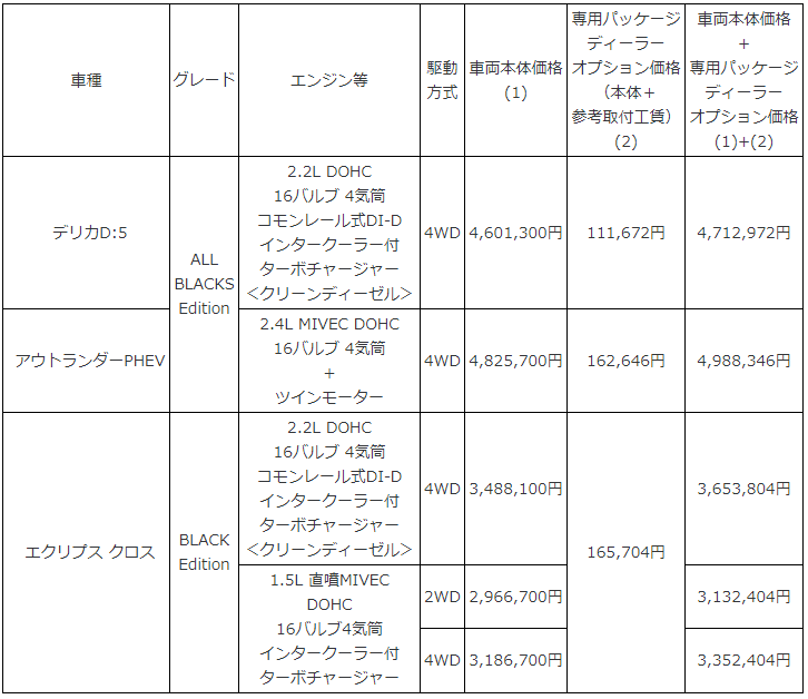 *2: 写真掲載車種は、『デリカD:5』 「ALL BLACKS Edition」の、専用パッケージディーラーオプショ「ALL BLACKS Complete Package」、推奨ディーラーオプションRAYSアルミホイール(ブラック)+ブラックホイールロックナット&ラグナットセット、ヘビーデューティキャリア(ブラック)装着車。