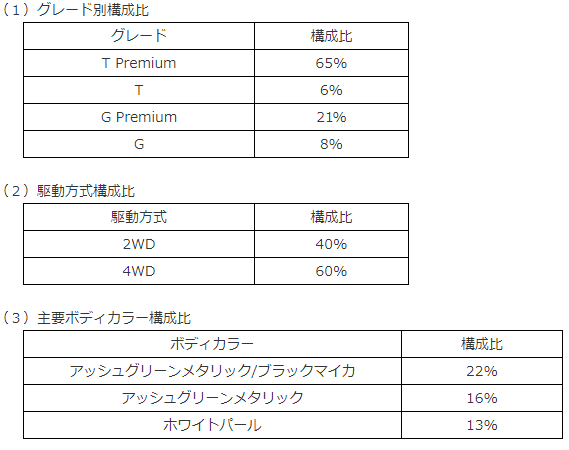 新型『デリカミニ』は1月13日(金)より予約注文を受付開始し、昨日までの受注台数は約9,000台に達しています。受注傾向としては、全体の約6割のお客様が4WDモデルを選ばれており、装備の充実したPremiumグレードが8割を超えています。