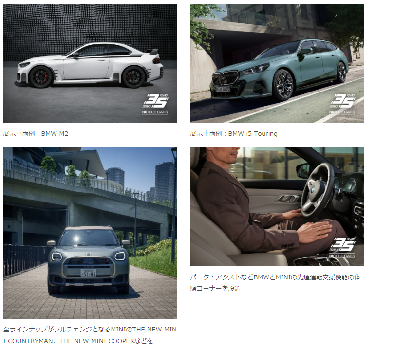 ニコル・カーズで取り扱うBMW(M2 Coupe、i5 Touringなど)とMINI(New Countryman、MINI Cooper SEなど)の最新モデルを10台以上展示し、ご自由にみられる。また、駐車をアシストする「パーキング・アシスト」などの先進運転支援機能の体験コーナーを設定し、モビリティの最新テクノロジーをご体験できる。