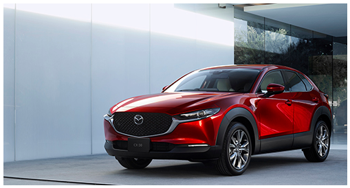 外観デザインは、滑らかで伸びやかなボディ曲面による美しさと、ホイールアーチ部とボディ下部の幅広クラッディングパネルによるSUVらしい力強さを両立した。また、ボディ曲面に写る景色が、クルマの動きとともに表情を変え、場所や季節などによって変化し、見る人の感性を刺激する。 また、高さ制限のある立体駐車場の利用が可能であり、市街地でも取り回しが良く運転しやすいボディサイズ、ベビーカーとキャリーオンバッグなどを同時に積載できる荷室、乗降しやすいシートの高さなど、日常の使いやすさを追求しました。新世代車両構造技術*2、「SKYACTIV-X(スカイアクティブ エックス)2.0」*3をはじめとする最新のエンジン、そしてAWD車には「オフロード・トラクション・アシスト」機能を採用して、安心感と自在感のある運転フィールを実現。これらにより、どこへでも気軽に出かけられる機動性を高めた。 さらに、大人4人がゆったりと過ごせる室内空間と高い静粛性、臨場感のあるオーディオシステム、細部までこだわった質感の高いインテリアが、大切な人と過ごす時間に彩りを添える。運転しやすい広い視界、適度にホールド感のあるシート、そして先進の安全技術が、心に余裕のあるドライブを可能にした。 丸本 明(まるもと あきら)代表取締役社長兼CEOは、次のように述べている。「CX-30は、市場がSUVにシフトしている中、マツダの基幹車種の一つであるCX-5に続き、ブランドを牽引し、今後のマツダのビジネスを支えていく柱のひとつとなる、重要な商品です。これまで接点がなかったお客様も含め、広くマツダ独自の価値をご体感いただき、『お客様と最も強い絆で結ばれたブランド』になることを目指してまいります。」