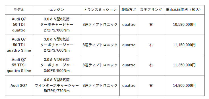 アウディ ジャパンは、最大7人乗り、広く上質な室内空間を備えたプレミアムSUV、新型Audi Q7/SQ7を発表、全国のアウディ正規ディーラー(122店舗、現時点)を通じて、本日より発売する。