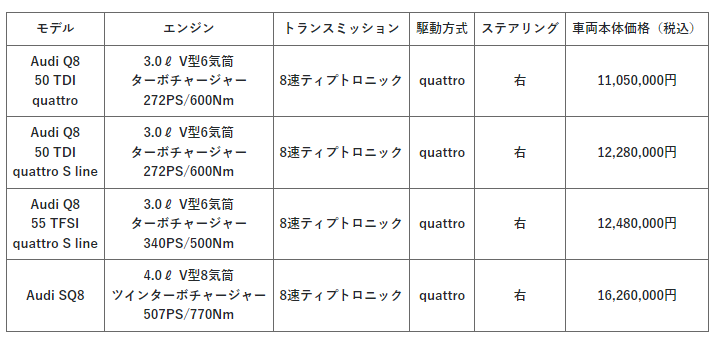 新型Audi Q8は、最高出力200kW(272PS)、最大トルク600Nmを発揮する50 TDI V型6気筒3.0ℓ直噴ディーゼルエンジンと、最高出力250kW(340PS)、最大トルク500Nmを発揮する55 TFSI V型6気筒3.0ℓ直噴ガソリンエンジンの2タイプを用意し、8速ティプトロニック、quattroフルタイム4輪駆動を採用している。55 TFSI は、さらなる高効率と快適な走行を実現する48V電源とリチウムイオンバッテリー、ベルト駆動式オルタネータースターター(BAS)を採用したマイルドハイブリッド(MHEV)システムを搭載している。