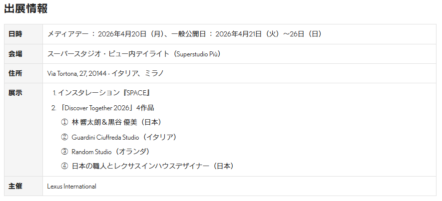 新着ニュースLEXUS、ミラノデザインウィーク2026に出展