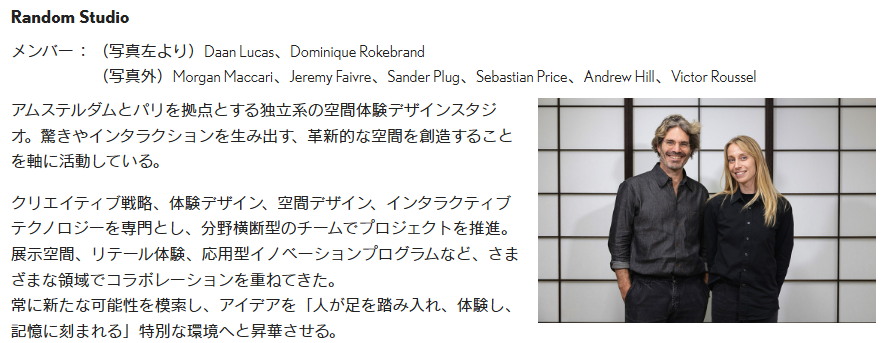 「目に見えない感情の動きこそ人生に彩りを与えると私たちは信じています。日本には、目に見えないものを大切にする文化や思想があります。私たちはこの空間を、光の移ろいによって時と空間を感じる茶室に見立てました。茶室は身分や人種を越えて人々を平等につなぎ、小さな空間だからこそ心を通わせる場です。にじり口は頭を下げて入ることで視界を一度切り、茶室という別世界への移行を身体的にもたらします。床の間と庭園は季節や時を表現し、記憶と結びついた情景として心を動かす。その移ろいを映像で表現し、光と空間を広げ、小宇宙のような体験を生み出しました。」
