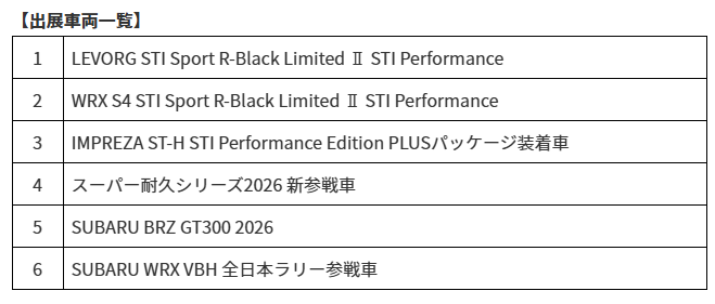 SUBARUは、同社のモータースポーツ統括会社であるスバルテクニカインターナショナル株式会社*1と共同で、2026年1月9日~11日に幕張メッセ(千葉県千葉市)で開催される「東京オートサロン 2026」に出展する。