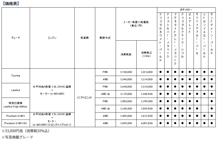 また、e-BOXER(2.0L直噴エンジン+モーター)搭載の「Limited」をベースとした特別仕様車「Limited Style Edition」を新たに設定。ルーフレールやリヤガーニッシュなどをブラック基調にするとともに、イエロー塗装加飾付LEDフロントフォグランプやシート表皮、シフトブーツやステアリングホイールのステッチなどにイエローアクセントを施すことで、大人の落ち着きの中に、遊び心を感じるモデルに仕上げた。
