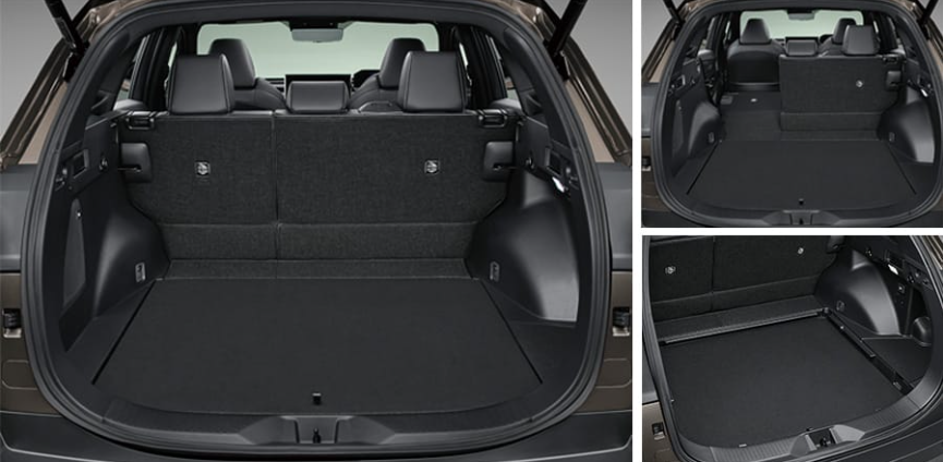 6:4分割可倒式リヤシート使用時でも荷室長1,092mm*3、荷室高850mm*4を確保しました。アクティブなお客様の行動範囲を広げる619L*5もの大容量ラゲージスペースを実現している。
